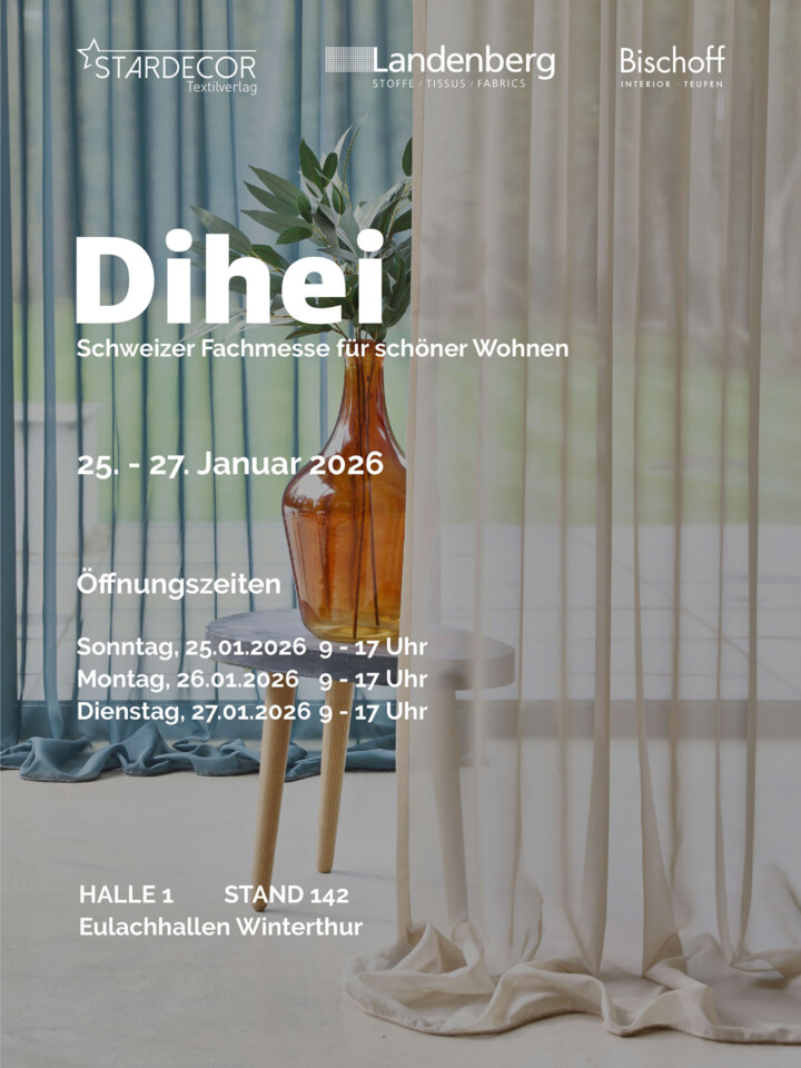 Besuchen Sie uns auf der Dihei 2026, der Schweizer Fachmesse für schöner Wohnen! Vom 25. bis 27. Januar 2026 präsentieren wir in den Eulachhallen Winterthur (Halle 1, Stand 142) unsere neuesten Kollektionen. Lassen Sie sich inspirieren und erleben Sie Designneuheiten hautnah.